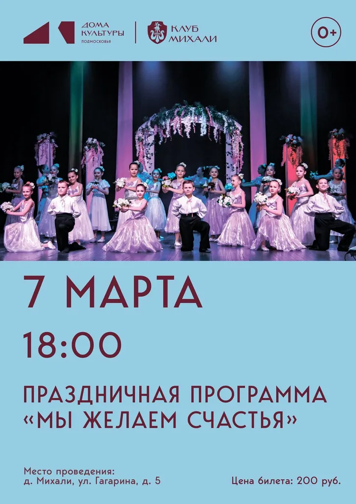 Праздник 8 Марта- это праздник любви и восхищения женщинами. В канун Международного женского дня в Михалевском культурно-досуговом центре пройдет концертная программа «Мы желаем счастья». В этот светлый весенний день участники творческих коллективов поздравят всех женщин с наступающим праздником. Как прекрасно, что есть в году такой замечательный день, когда можно услышать столько признаний в любви, почувствовать радость и увидеть огромное счастье в глазах женщин. Концерт будет незабываемым. И, конечно, все номера будут посвящены прекрасной половине человечества. В концерте примет участие Михаил Ерохин - Никиткинский СДК.